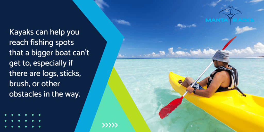 Heading out on the lake in a kayak lets you soak up the beauty of the lake and the calm surrounding you. It’s perfect for getting to those quiet spots where the fish are biting or just exploring hidden parts of the lake. You can reach fishing spots you never could have on a bigger boat, especially if there are logs, sticks, brush, or other obstacles that you can only maneuver in a kayak.